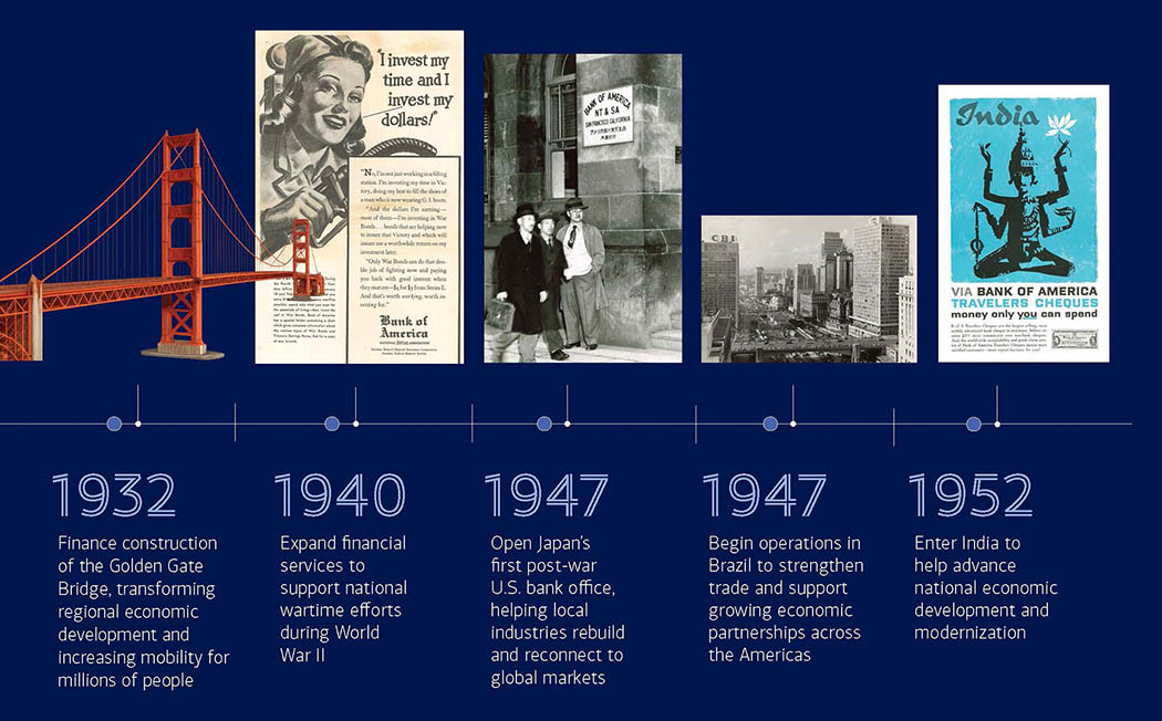Before we get to the United States, one could ask how Bank of America became so active around the world. We now serve 90 global markets. Our global expansion began many years ago as America’s reach and influence expanded. We grew by helping America’s entrepreneurs and business owners as they pursued their global ambitions. We followed our government when it needed us to open new markets or rebuild after global conflicts.