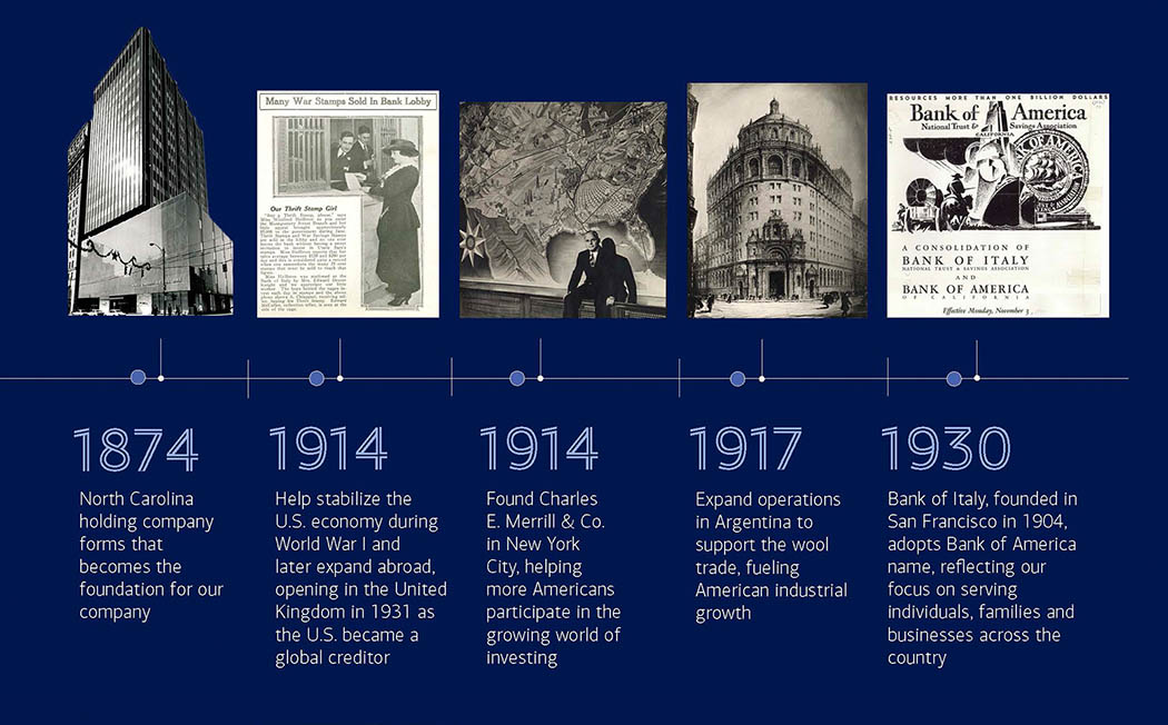 1930 - Bank of Italy, founded in San Francisco in 1904, adopts Bank of America name, reflecting our focus on serving individuals, families and businesses across the country