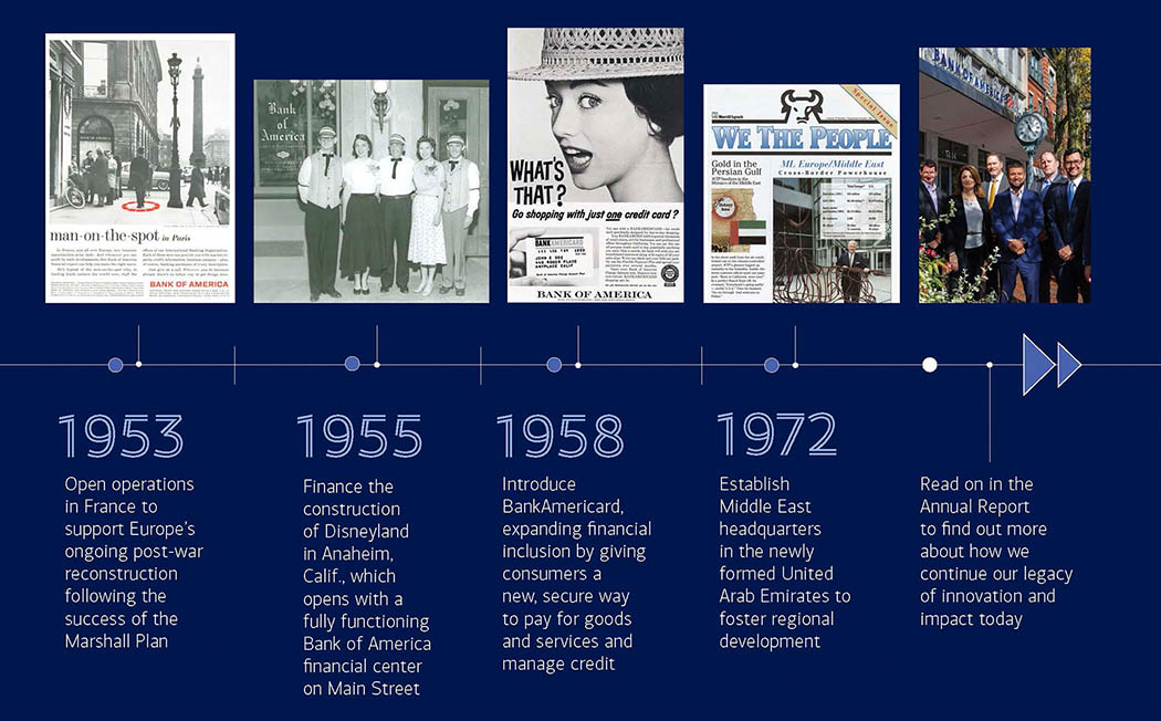 Companies that are now Bank of America provided funding for the Erie Canal, the Golden Gate Bridge and the American government’s requirements for the War of 1812, World War I and World War II, as well as many other national priorities. We helped form the national currency. As the needs of capital for our clients exceeded the banks’ capacity, Merrill Lynch formed to raise capital. U.S. Trust formed to develop access to investing and pioneered trust banking more than 170 years ago. We even funded some of America’s great cultural touchpoints, including the film “Gone with the Wind” and Disneyland!